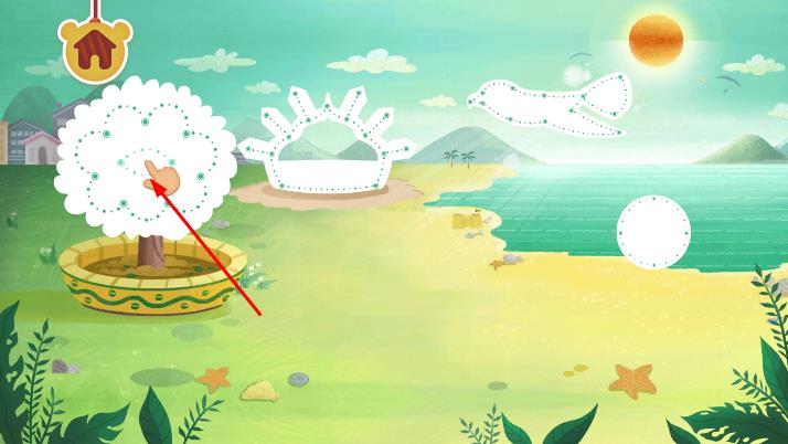 1、進(jìn)入界面,點(diǎn)擊屏幕上的巧克力圖標(biāo),在場(chǎng)景中,點(diǎn)擊屏幕上的樹木等元素,進(jìn)入繪制環(huán)節(jié)。