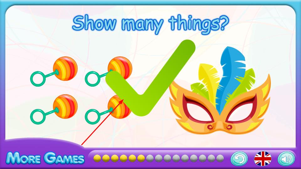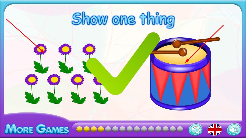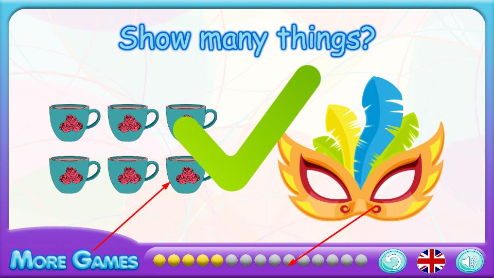 2、識(shí)別界面左右區(qū)域物品,數(shù)清左側(cè)目標(biāo)物品數(shù)量如首關(guān)紫色花朵1朵、后續(xù)藍(lán)色杯子6個(gè)、彩色撥浪鼓4個(gè),計(jì)數(shù)正確時(shí),中間彈出綠色對(duì)勾確認(rèn)。
