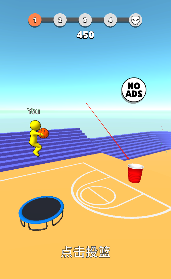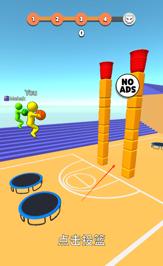 1、小人在蹦床上不停蹦跳,我們需要在小人跳到合適高度的時候點擊屏幕讓籃球進桶即可。