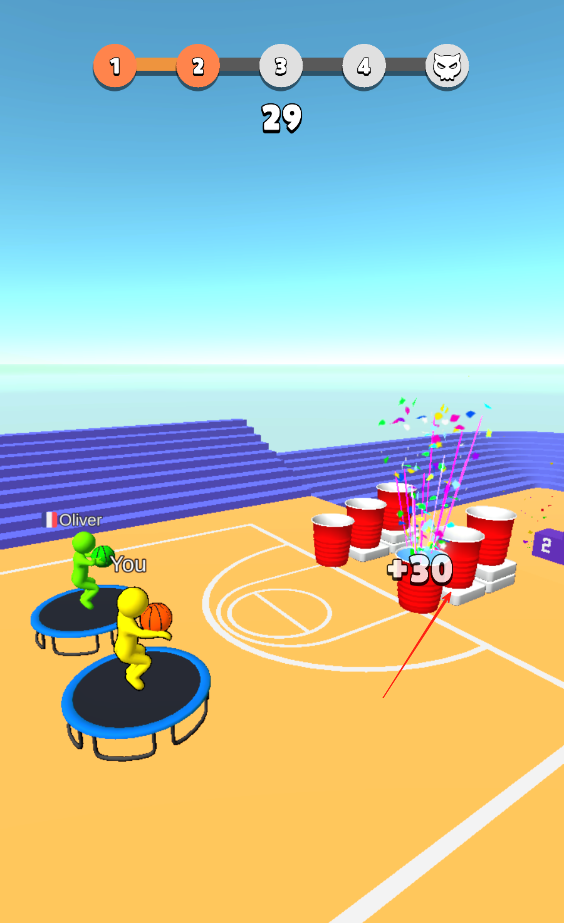 3、豐富視覺反饋:籃球入筐時的特效和音效極具成就感,小人彈跳的動畫流暢自然,從蹦床形變到籃球飛行軌跡都清晰呈現(xiàn),大大增強玩家對游戲的沉浸式體驗。