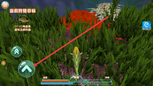 2、注意當(dāng)前的狩獵任務(wù),根據(jù)目標(biāo)魚特征包括外形和位置 ,在海草區(qū)搜索,利用沖刺快速接近,完成擊殺升級(jí)。