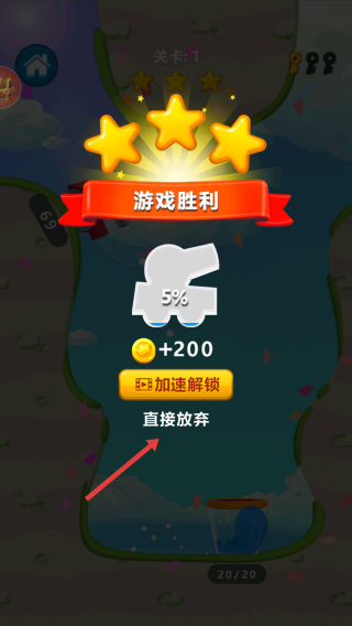 3、在游戲中,當(dāng)完成關(guān)卡任務(wù)后,可選擇立即加速解鎖按鈕加快解鎖進(jìn)度,或點(diǎn)擊直接放棄按鈕結(jié)束當(dāng)前關(guān)卡,重新開始挑戰(zhàn)。