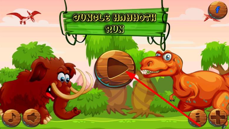 1、打開游戲界面后,點擊中間木質(zhì)播放的按鈕,操控猛犸象開啟叢林奔跑冒險,躲避恐龍等障礙。