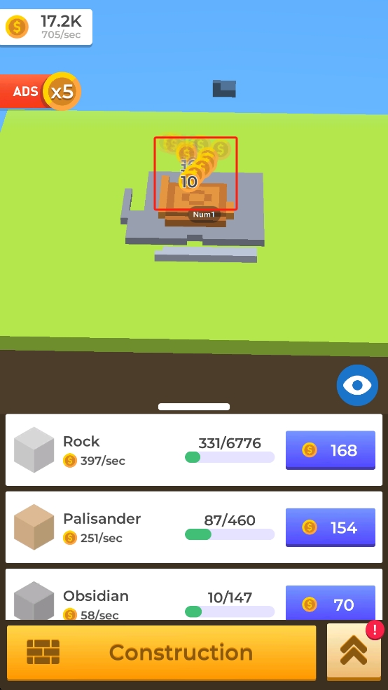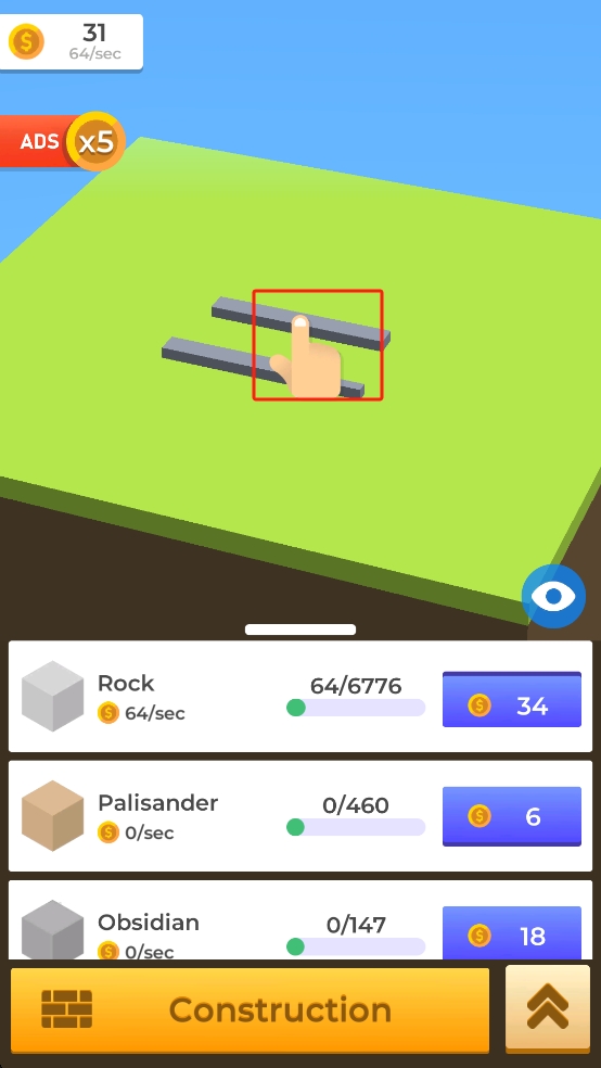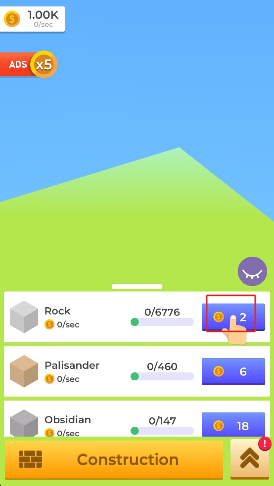 1、進(jìn)入游戲界面,看到金幣收益和資源列表,點(diǎn)擊Rock旁帶金幣數(shù)字的藍(lán)色按鈕,消耗對(duì)應(yīng)金幣,解鎖或升級(jí)巖石資源產(chǎn)出。