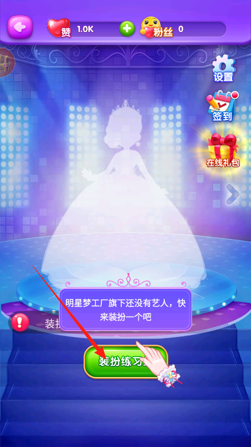 1、進(jìn)入明星夢(mèng)工廠界面,看到提示旗下還沒藝人,快來裝扮,點(diǎn)裝扮練習(xí)生按鈕,這就開啟藝人裝扮玩法,接下來要從發(fā)型妝容服裝開始,打造專屬藝人形象。