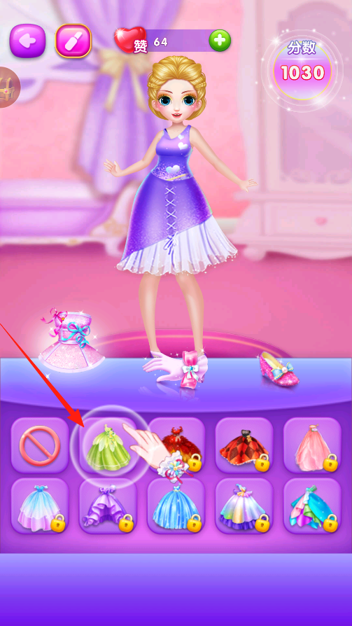 3、進(jìn)入服裝搭配,下方有各種裙子,點(diǎn)想換的裙子,直接給人物穿上,搭配不同風(fēng)格服飾,像換綠色短裙粉色長(zhǎng)裙,每換一套,分?jǐn)?shù)變化,看怎么搭配能拿到更高分。
