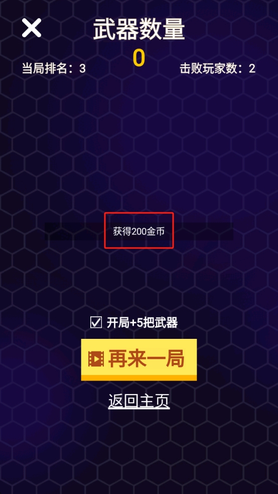 3、當(dāng)局結(jié)束,界面顯示了排名第3和擊敗2人,獲得200金幣獎勵,可點擊下方按鈕開啟新的對局。
