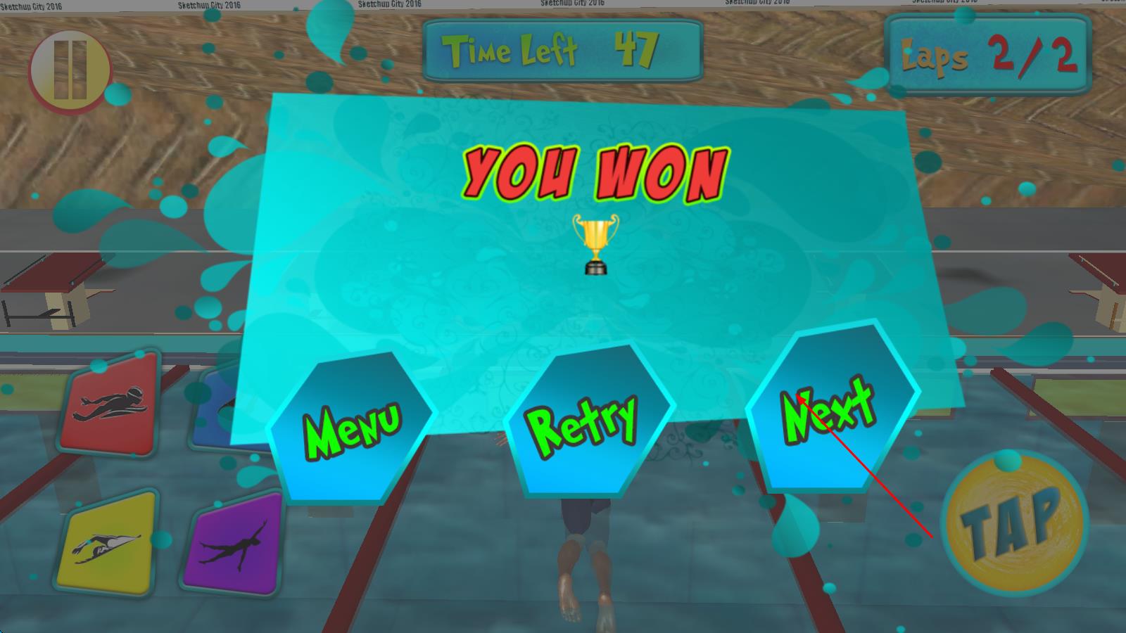 3、當(dāng)率先觸碰到終點(diǎn)池壁,完成游泳項(xiàng)目的競(jìng)速挑戰(zhàn),即可獲得勝利,解鎖更高級(jí)別的賽事與更復(fù)雜的游泳場(chǎng)景。