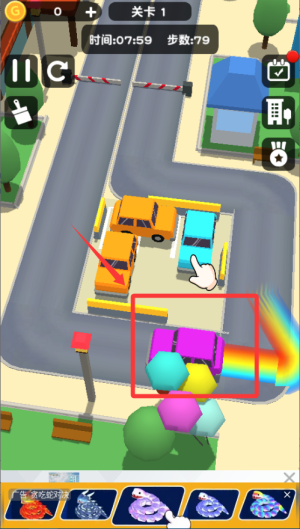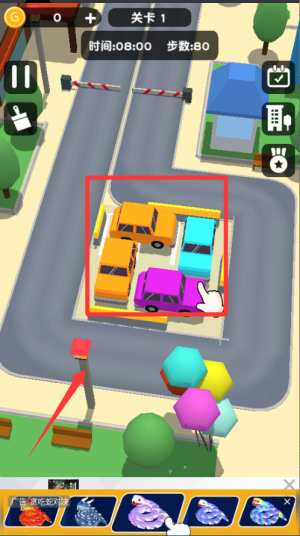 1、開(kāi)始游戲后先觀(guān)察整個(gè)停車(chē)場(chǎng)的車(chē)輛位置,找出被堵住的車(chē)和出口方向,確定哪輛車(chē)需要先移動(dòng)才能疏通道路。