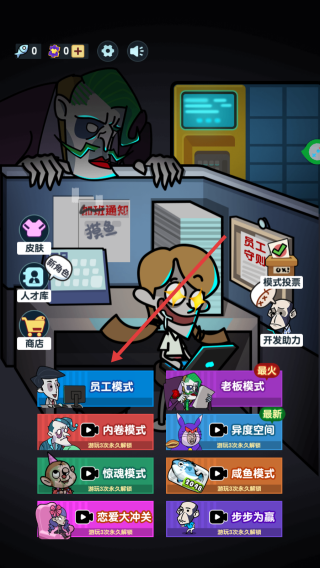 3、利用人才庫,商店等系統(tǒng)提升角色能力,切換模式老板模式等體驗(yàn)不同玩法,推進(jìn)游戲進(jìn)程。