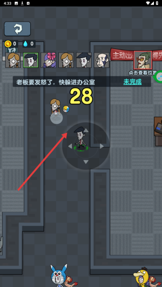2、根據(jù)提示,如老板要發(fā)怒了,快躲進(jìn)辦公室,移動(dòng)角色避開危險(xiǎn),完成限時(shí)任務(wù),獲取獎(jiǎng)勵(lì)。