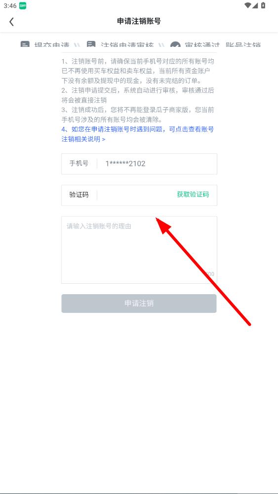 4、在申請注銷賬號頁面,確認(rèn)手機(jī)號后點擊獲取驗證碼,最后點擊申請注銷,按照提示完成后續(xù)操作即可。