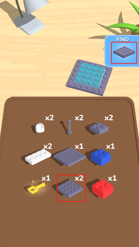 2、整理零件清單,確認(rèn)所需灰色底板數(shù)量,從下方零件堆中選取指定的2個(gè)灰色底板,完成收集任務(wù)。