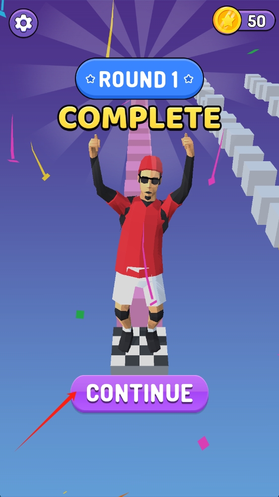 3、完成第1關(guān)后,在關(guān)卡完成界面點(diǎn)擊CONTINUE,進(jìn)入下一關(guān),繼續(xù)挑戰(zhàn),贏取更多金幣獎(jiǎng)勵(lì)。