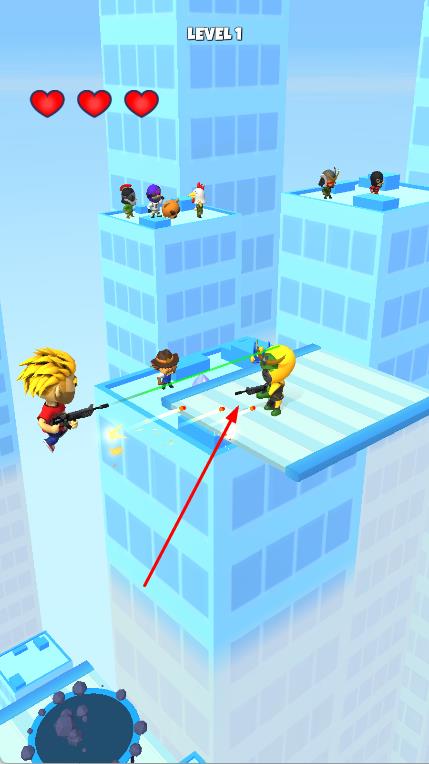 2、角色會(huì)借助蹦床彈起,在空中時(shí),操控角色移動(dòng)并瞄準(zhǔn)敵人,點(diǎn)擊屏幕進(jìn)行射擊,擊敗對(duì)手。