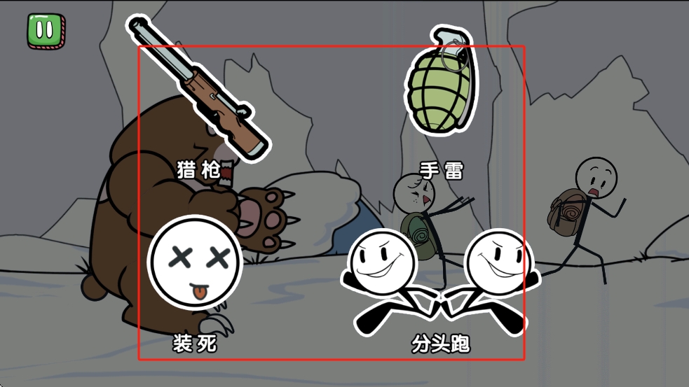 1、開局我們需要逃離熊的追擊,此時(shí)屏幕上出現(xiàn)了4種選項(xiàng),根據(jù)不同的選項(xiàng)會(huì)出現(xiàn)不同的結(jié)局。