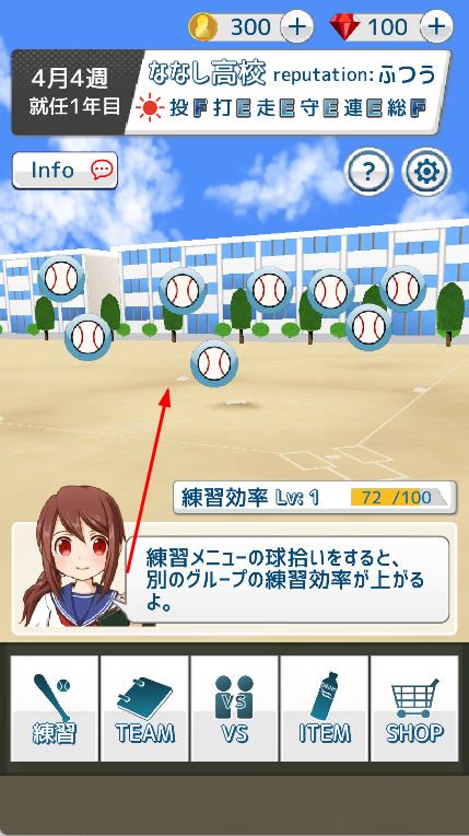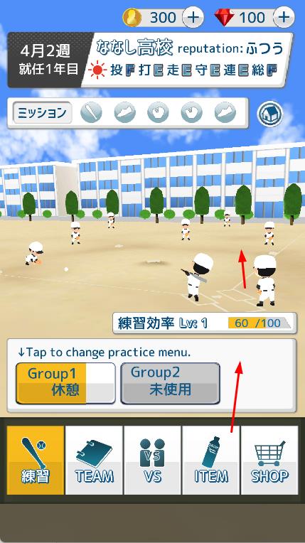 2、點擊練習(xí)按鈕進(jìn)入練習(xí)模式,在練習(xí)場景中,可看到隊員們進(jìn)行棒球練習(xí),通過屏幕上的操作提示,點擊切換練習(xí)菜單,調(diào)整練習(xí)分組和練習(xí)內(nèi)容。