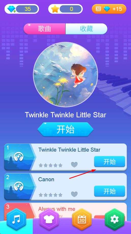 1、進(jìn)入游戲后選擇喜歡的動漫曲目,等待前奏結(jié)束,屏幕將出現(xiàn)下落的鋼琴塊,準(zhǔn)備跟隨節(jié)奏點(diǎn)擊。