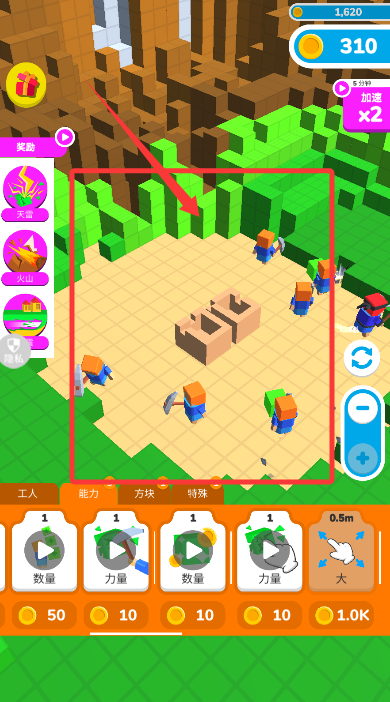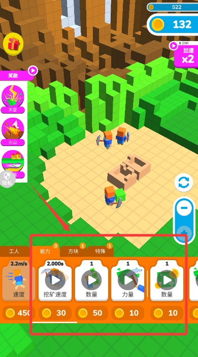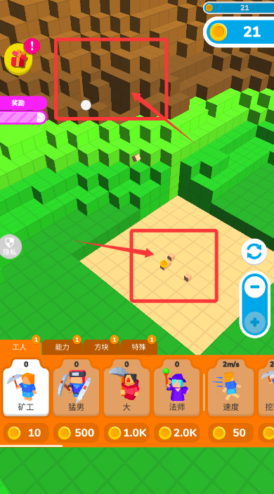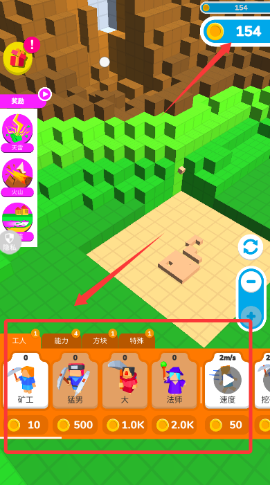 2、通過每次挖掘可以獲得金幣,用于雇傭新工人或強化開采技能。