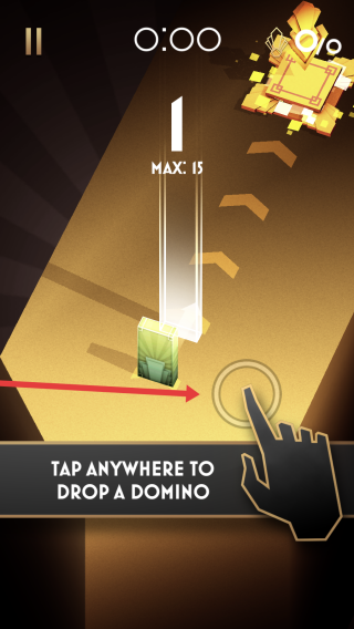 3、游戲過程中觀察骨牌下落時機,當出現(xiàn)TAP-ANYWHERE-TO-DROP-A-DOMINO提示時,找準時機點擊屏幕,在MAX-15的數量限制內放下多米諾骨牌。