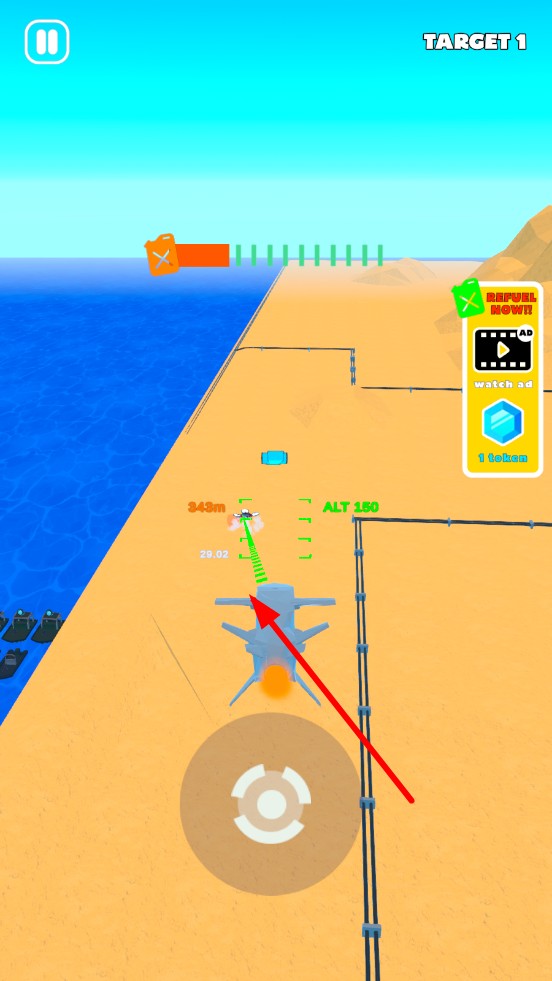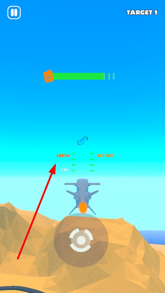 1、進(jìn)入游戲后,滑動虛擬搖桿操控導(dǎo)彈飛行方向,有距離目標(biāo)遠(yuǎn)近的提示,留意上方燃油條消耗情況,開啟初始飛行挑戰(zhàn)。