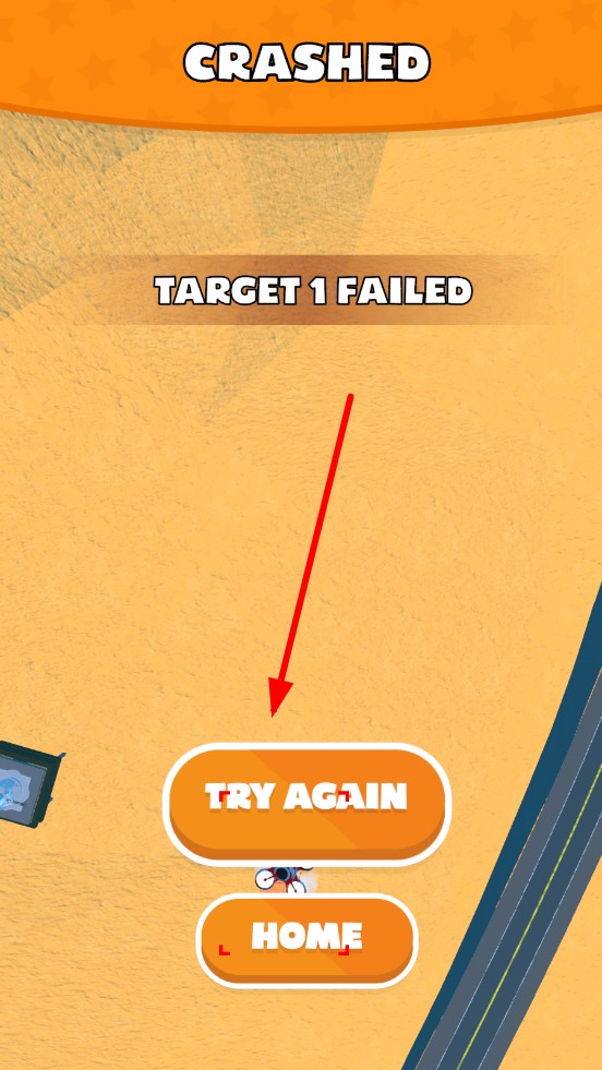 1、即時反饋機(jī)制:燃油耗盡、撞擊瞬間觸發(fā)CRASHED失敗動畫,TRY AGAIN按鈕一鍵重試,縮短等待時間,保持闖關(guān)節(jié)奏的緊湊與流暢。
