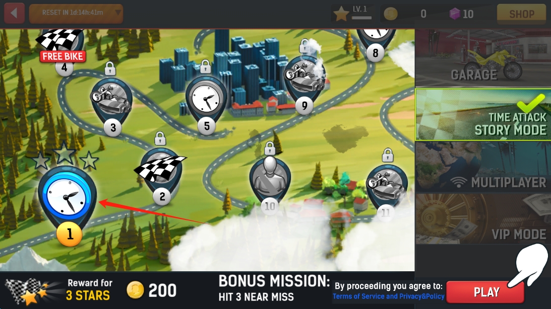 1、地圖關(guān)卡界面,選帶時(shí)鐘標(biāo)識(shí)的關(guān)卡1,留意FREE-BIKE、BONUS-MISSION,點(diǎn)擊進(jìn)入。