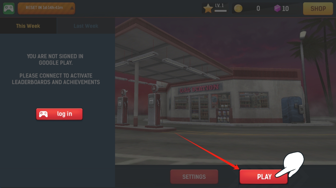 2、加油站場(chǎng)景界面,點(diǎn)擊PLAY,開(kāi)啟摩托競(jìng)速挑戰(zhàn),進(jìn)入游戲駕駛環(huán)節(jié),點(diǎn)擊進(jìn)入游戲。