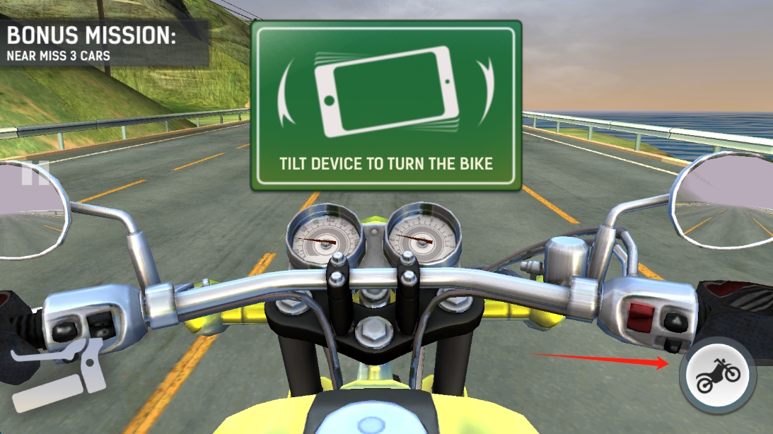 3、駕駛界面,按TILT-DEVICE-TO-TURN-THE-BIKE提示,傾斜設(shè)備轉(zhuǎn)彎,完成近距避讓3輛車(chē)任務(wù)。