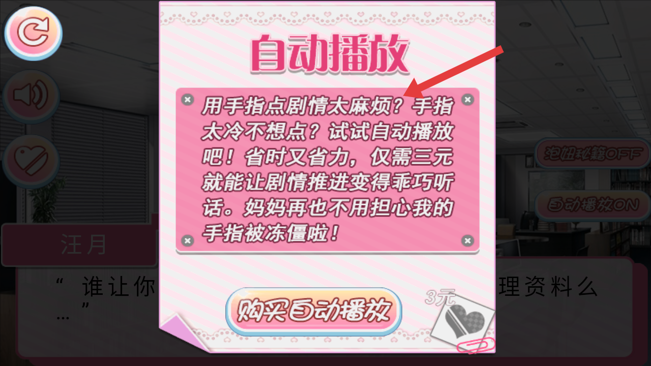 1、若嫌手動(dòng)點(diǎn)擊劇情麻煩,可以花費(fèi)3元購(gòu)買(mǎi)彈窗中的自動(dòng)播放的功能,開(kāi)啟后劇情將自動(dòng)推進(jìn)。