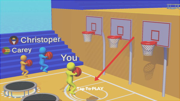 1、點擊場地上的Tap-To-PLAY,開啟與Christopher、Carey的籃球?qū)Q,利用蹦床等場地元素,開啟趣味投籃競賽。