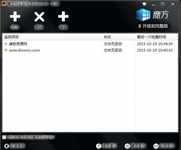 魔方網(wǎng)址監(jiān)控是一款簡(jiǎn)單實(shí)用的網(wǎng)站監(jiān)控軟件,能夠第一時(shí)間監(jiān)視網(wǎng)站更新的軟件或游戲版本的情況,從而讓用戶第一時(shí)間體驗(yàn)全新的軟件或游戲。軟件界面簡(jiǎn)潔大方,使用操作也簡(jiǎn)單,添加目標(biāo)網(wǎng)址后即可監(jiān)視。當(dāng)目標(biāo)網(wǎng)址出任何現(xiàn)狀態(tài)時(shí),魔方網(wǎng)址監(jiān)控都會(huì)彈出氣泡提醒用戶,快下載試試吧。只需要添加需要監(jiān)視的網(wǎng)頁網(wǎng)址,當(dāng)網(wǎng)頁內(nèi)容變化時(shí),軟件會(huì)給出氣泡提示,需要的朋友不要錯(cuò)過。