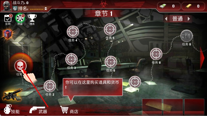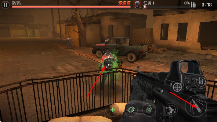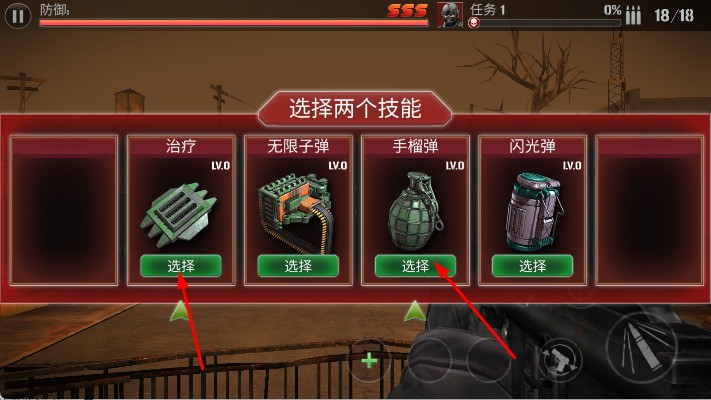 2、任務(wù)開始前,選擇兩個技能,進(jìn)入射擊場景,利用手中武器,瞄準(zhǔn)并射殺出現(xiàn)的喪尸,點(diǎn)擊技能按鈕釋放對應(yīng)技能輔助戰(zhàn)斗。