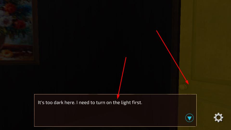 2、場(chǎng)景過(guò)暗時(shí)依據(jù)提示It's too dark here. I need to turn on the light first.,尋找照明裝置,定位門旁開(kāi)關(guān)區(qū)域。