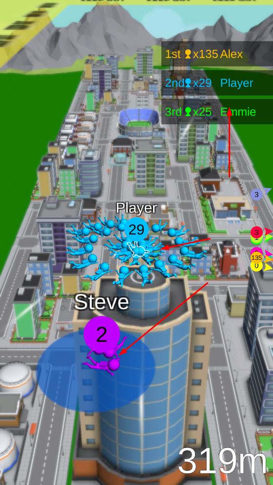 1、操控角色在城市地圖移動(dòng),吸引并收集空中、建筑旁的白色小人,壯大隊(duì)伍規(guī)模。