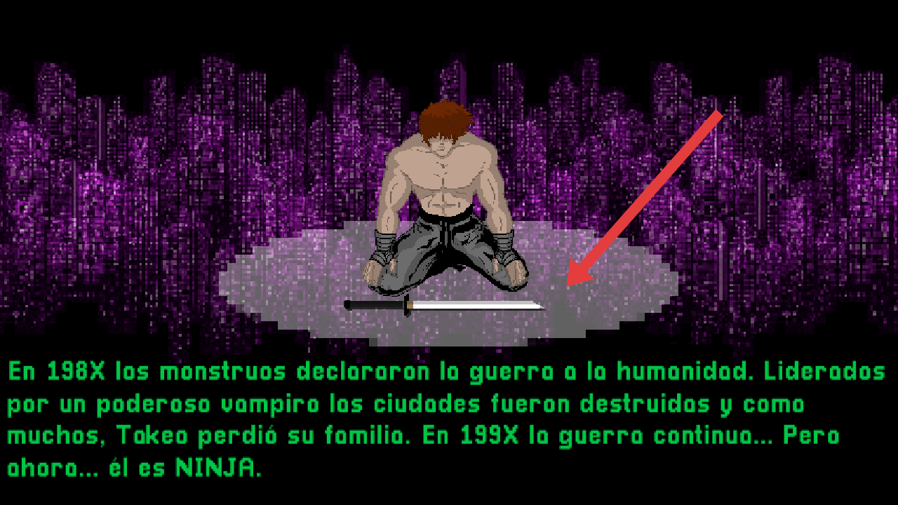 2、進入游戲后,需要了解198X怪物戰(zhàn)爭背景,拾取Takeo面前的刀,開啟NINJA的復仇冒險。
