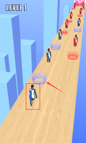 2、操控紅框藍白角色,沿跑道避開紅色平臺。
