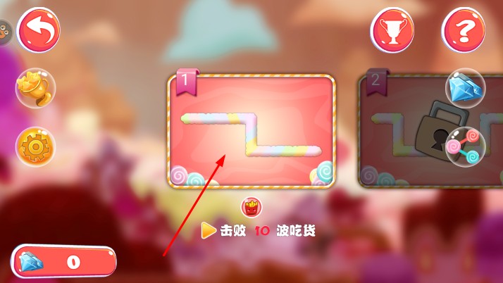 2、點擊開始吧進(jìn)入塔防場景,在塔防場景中,利用金幣在道路旁的位置建造防御塔,布置防線抵御一波波吃貨進(jìn)攻。