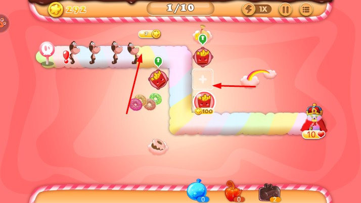 2、波次應(yīng)對動態(tài)調(diào)整:每波進(jìn)攻前查看吃貨類型,如甜甜圈幽靈穿墻需用糖果塔眩暈,用金幣升級對應(yīng)塔,發(fā)現(xiàn)路線漏洞實時補(bǔ)改地形,優(yōu)化防御。