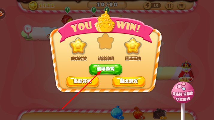 3、合理搭配防御塔與地形,成功抵擋10波吃貨進(jìn)攻后,點擊繼續(xù)游戲挑戰(zhàn)下一關(guān)卡。