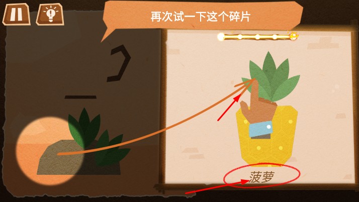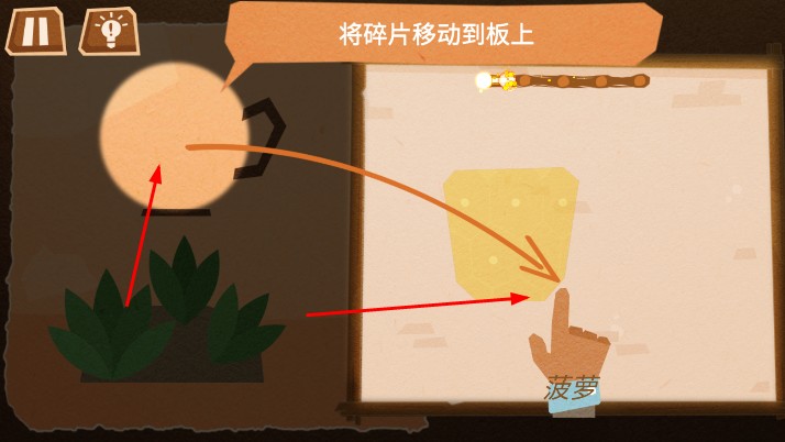 2、即時反饋清晰直觀:碎片嵌入正確位置時,觸發(fā)吸附效果,如菠蘿碎片拼接成功后完整顯示,每一步操作都有清晰反饋,增強解謎成就感。
