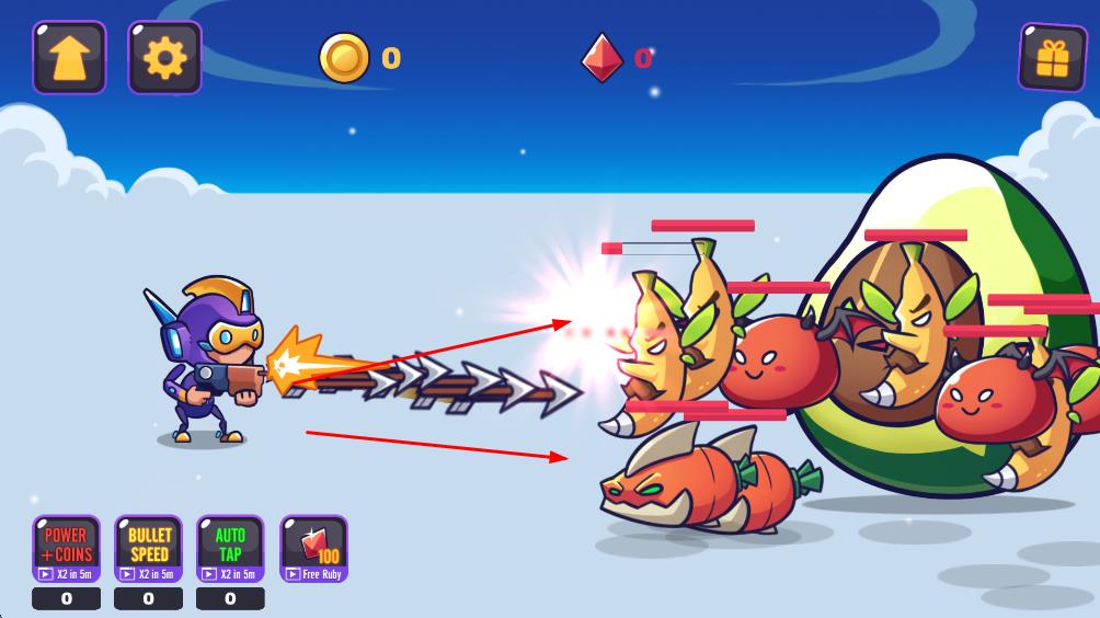 1、進(jìn)入戰(zhàn)斗界面,操控角色使用武器射擊水果敵人,借助火力清除前方目標(biāo),推進(jìn)關(guān)卡進(jìn)程。