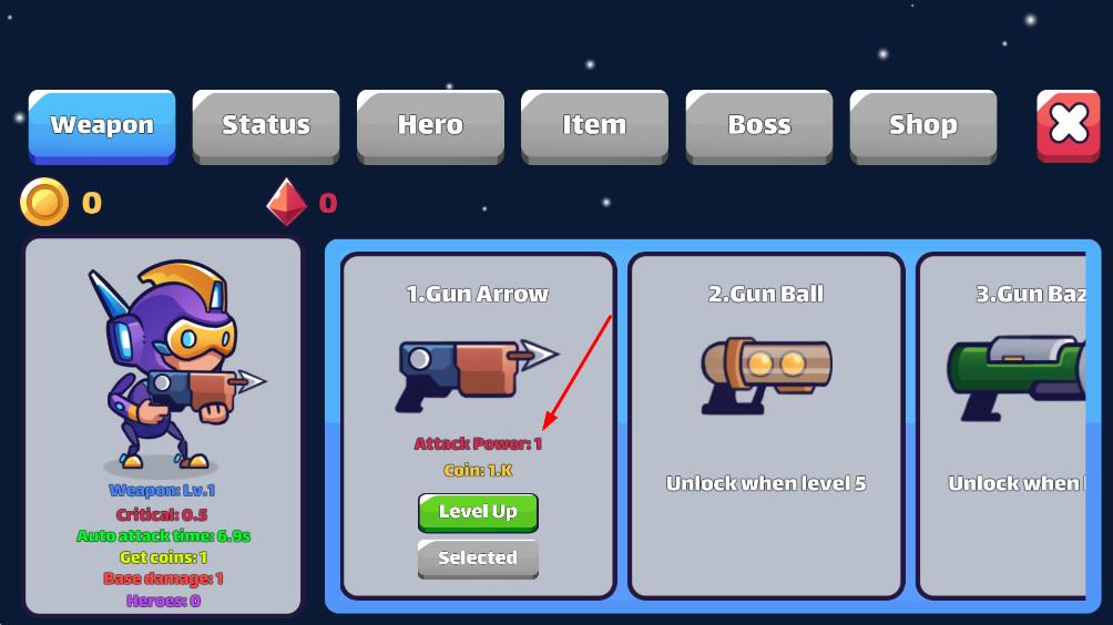 2、在武器界面,消耗金幣升級(jí)Gun Arrow等武器,提升攻擊能力,解鎖更高等級(jí)武器裝備。