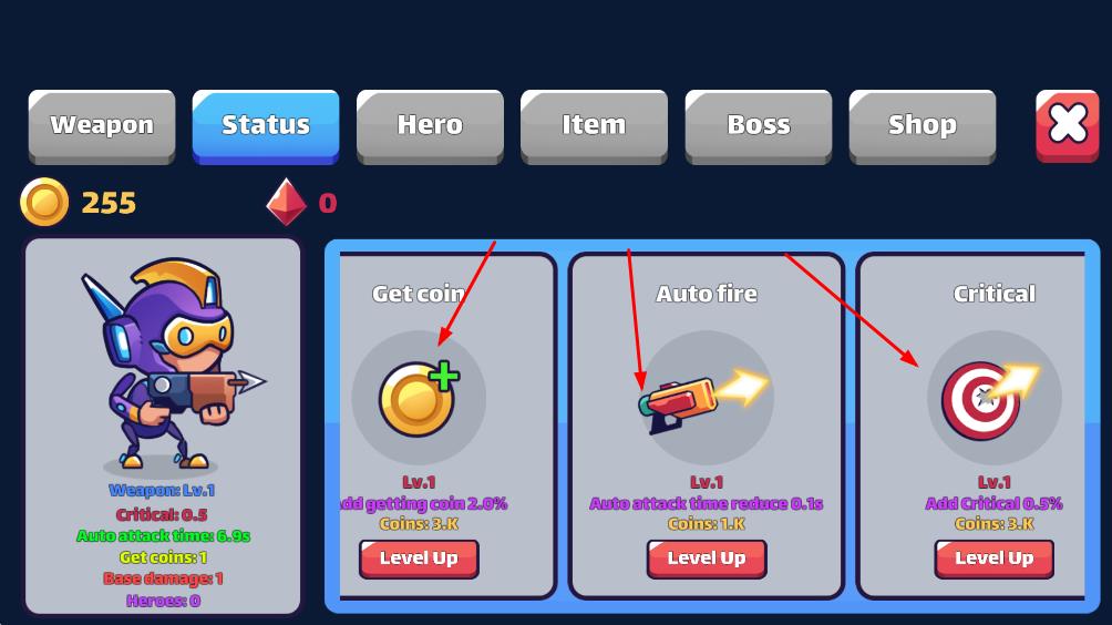3、切換至狀態(tài)界面,升級(jí)金幣獲取、自動(dòng)射擊、暴擊屬性,增強(qiáng)戰(zhàn)斗效率與收益能力。
