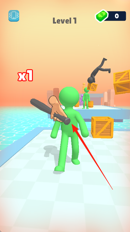 1、用棒球棍點擊綠色小人,觸發(fā)攻擊,注意界面【Level1】關(guān)卡、金幣【0】。
