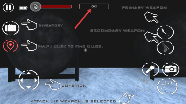 1、進(jìn)入游戲,點(diǎn)擊OK確認(rèn)界面的指引,熟悉功能鍵武器、背包、地圖的位置,為探險(xiǎn)探索做好準(zhǔn)備。