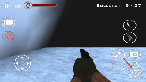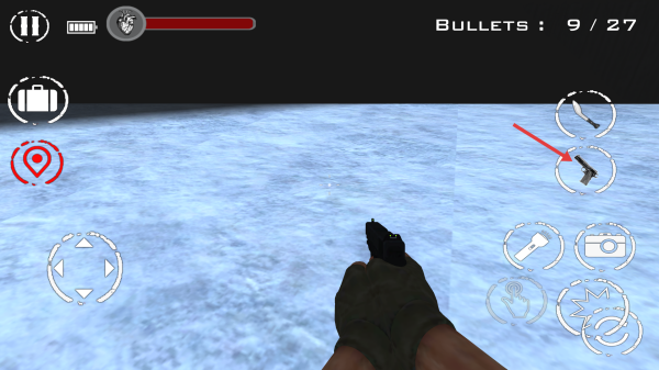 2、戰(zhàn)斗時(shí),點(diǎn)擊右側(cè)的武器圖標(biāo)來(lái)進(jìn)行切換主副武器如手槍?zhuān)垂翩I射擊,留意子彈數(shù)BULLETS。
