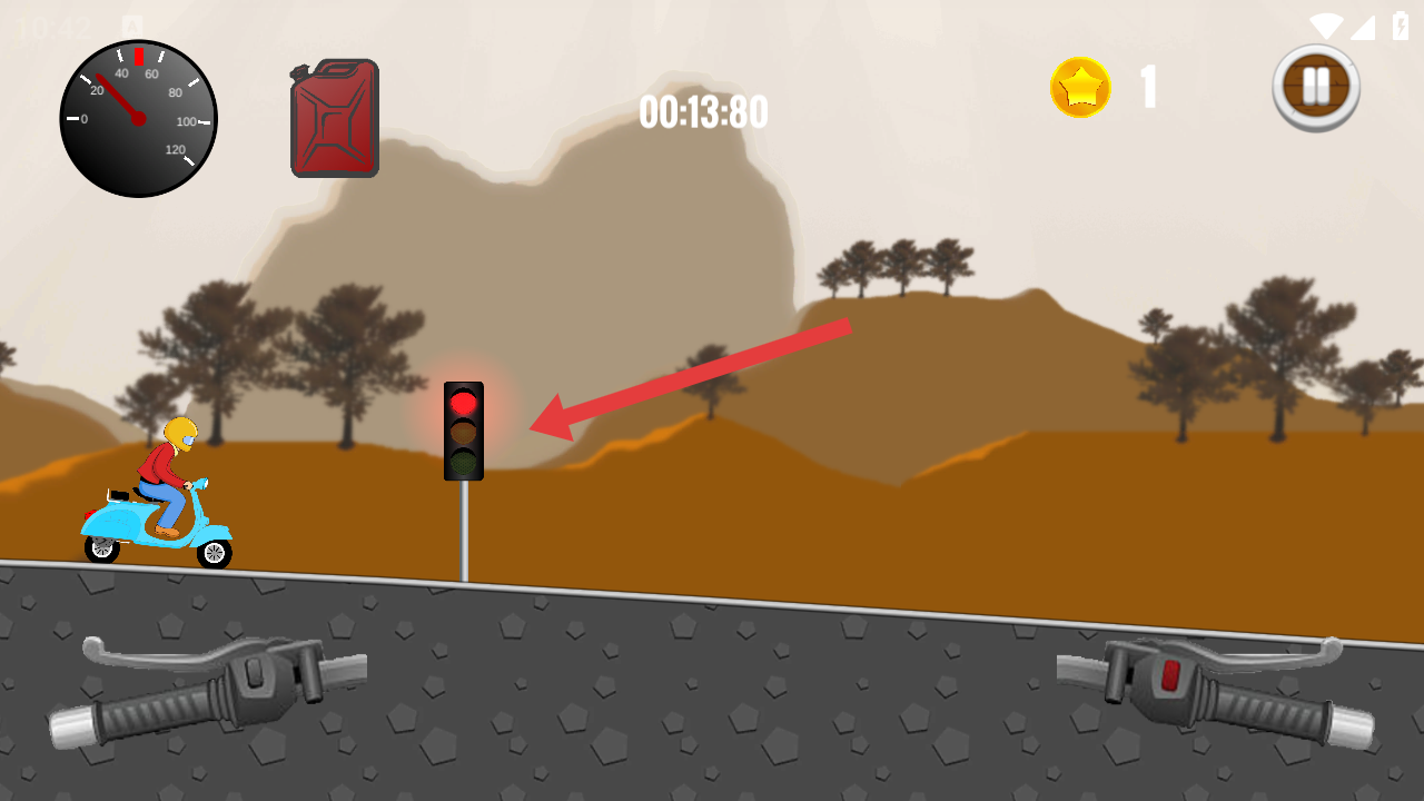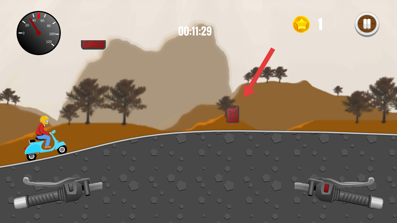 2、駕駛摩托車行駛時(shí),靠近紅色油桶并拾取,借助下方模擬車把控件調(diào)節(jié)車速,補(bǔ)充燃油以可以維持接下來的路程。