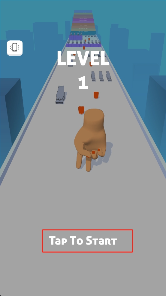 1、點擊Tap To Start開始游戲,控制手指角色在道路上前進,避開灰色障礙物,收集橙色道具,利用道路加速帶提升速度。