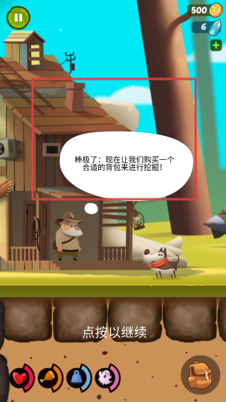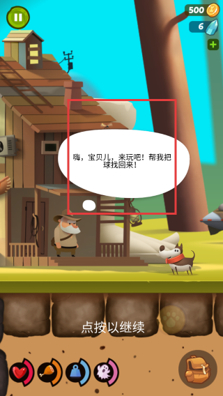 1、游戲開場(chǎng),跟隨老人對(duì)話,接找球任務(wù),點(diǎn)按繼續(xù),推進(jìn)劇情,解鎖挖掘玩法。